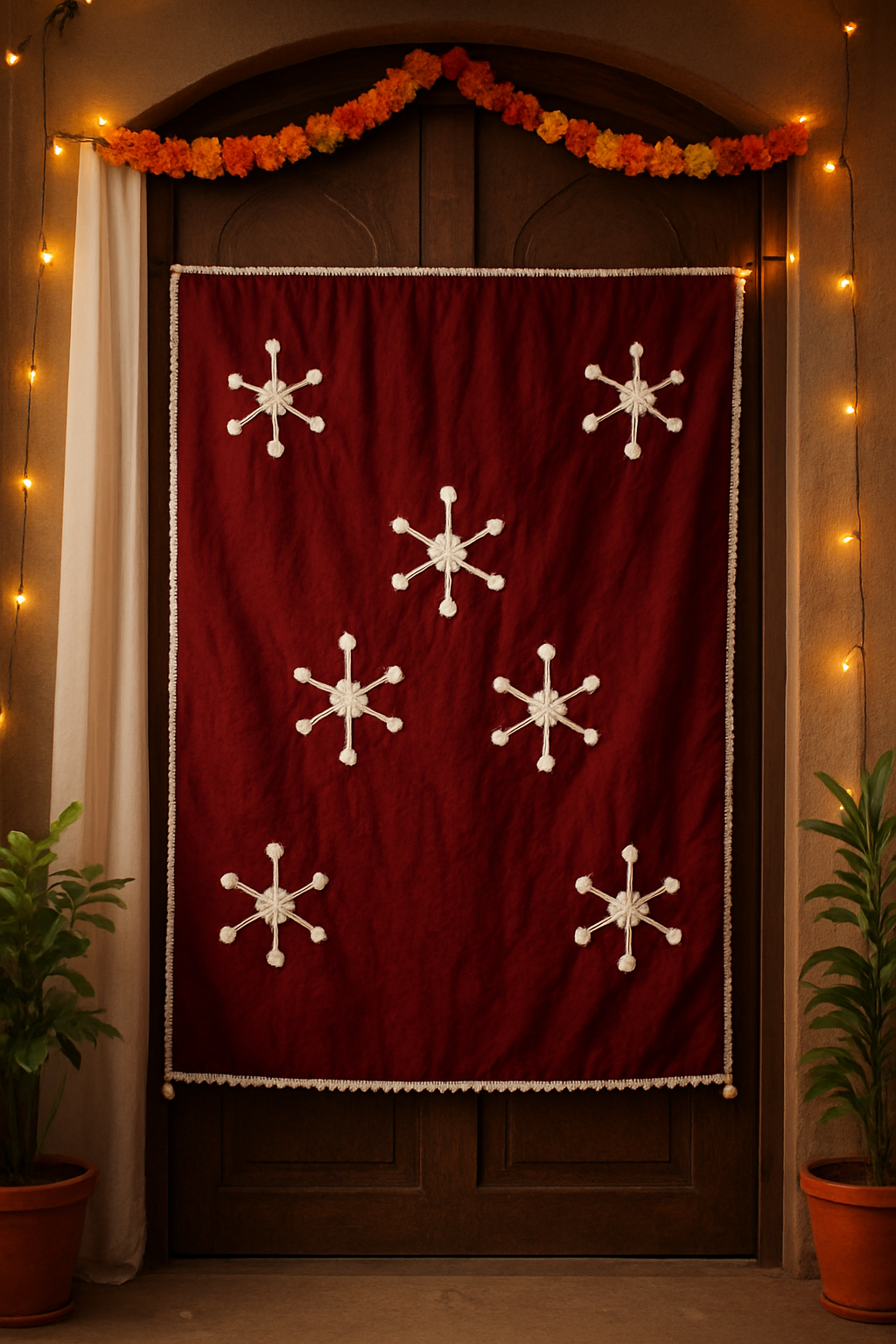 🌸✨ Add a touch of tradition and elegance to your home with this beautifully handcrafted gate parda. The rich maroon fabric decorated with delicate white crochet star motifs makes it a stunning choice for festive occasions, weddings, or everyday décor. 💫